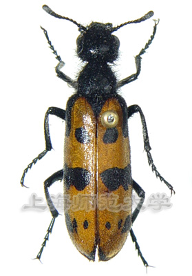 腋斑芫青体长约18mm。头和前胸黑色,鞘翅黄色有黑斑。