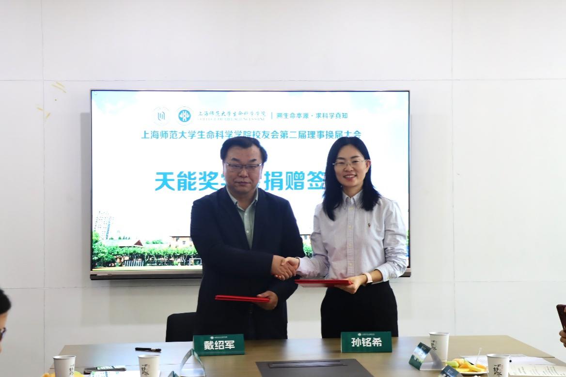 会上,与会校友审议并通过了生命科学学院校友会第一届理事会工作报告、第二届理事会成员名单(草案)。戴绍军为第二届理事颁发聘书,并与上海天能生命科学有限公司销售总监孙铭希代表双方签署协议,持续深化校企协同。
