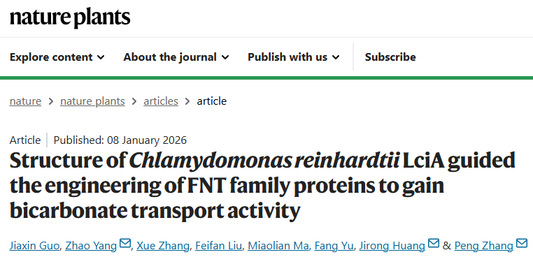 2026年1月8日,Nature Plants在线发表了上海师范大学黄继荣研究组与中国科学院分子植物科学卓越创新中心张鹏研究组合作完成的题为“Structure ofChlamydomonas reinhardtii LciA guided the engineering of FNT family proteins to gain bicarbonate transport activity”的研究论文。研究揭示了莱茵衣藻CO2浓缩机制CCM中HCO3⁻转运通道LciA的底物选择性机制,并通过结构指导的分子设计,成功实现HCO₃⁻转运活性的理性改造,为利用CCM改造C3作物提升光合效率提供了核心元件与分子策略。
