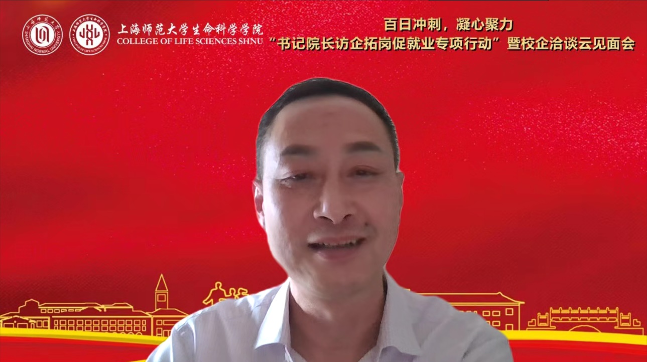 为进一步加强校企交流合作、推进毕业生就业工作,6月11日,生命科学学院举办了“访企拓岗促就业专项行动”校企洽谈云见面会。上海天能科技有限公司董事长孟诚卫、上海鹿明生物科技有限公司总经理舒烈波、复旦大学附属闵行实验学校校长姚伟、上海大地园艺种苗有限公司总经理袁文辉、上海药明生物公司人力资源部校招负责人乔东欣出席此次洽谈会,学校就业中心领导、生命科学学院党政领导班子、学院各硕士点负责人和专业负责人,以及毕业班辅导员共同参会。会议由学院党委书记康文主持。