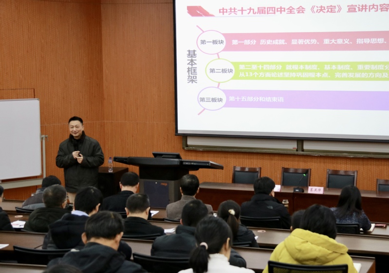 报告会上,林在勇同志紧扣党的十九届四中全会主题,围绕党的十九届四中全会召开的时代背景和重大意义;深刻认识中国特色社会主义制度和国家治理体系显著优势;准确把握坚持完善中国特色社会主义制度、推进国家治理体系总体要求、总体目标和具体要求;切实将党的十九届四中全会精神落到实处这四个方面对十九届四中全会精神进行了宣讲。