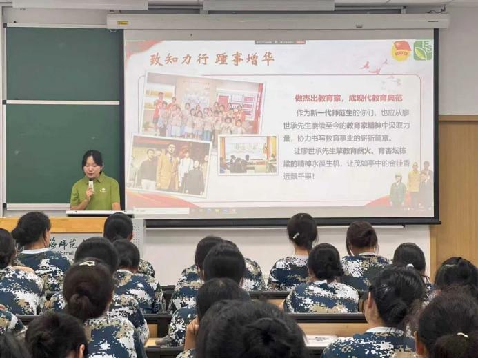 来自我校“弘扬教育家精神”个论课程宣讲团的刘周莹同学,以我校首任院长廖世承先生为镜,折射出一代教育家的崇高形象。廖先生将个人理想融入民族复兴洪流,以教育为信仰,以报国为初心,毅然归国、兴学育才,真正践行了“通过教育实现民族自救自立”的崇高使命。结合“厚德、博学、求是、笃行”的校训,刘周莹同学深刻阐释了教育家精神的多维内涵:它既源于中华传统师道文化的道德感召,又承载近代以来教育救国的价值引领,更彰显着新时代改革创新的实践动力。