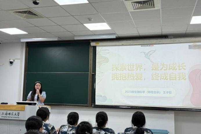 生物科学(师范)专业王子彤学姐以“探索世界,是为成长;拥抱热爱,终成自己”为引,分享了她在进博会志愿者、爱心暑托班等实践中的所见所感。她鼓励大家“把世界当作游乐场”,既要学会高效管理时间,也要追随内心、保持自信与无畏。她特别分享了自己选择师范专业的初心,希望未来有志成为一名老师的学弟学妹积极参与爱心学校和中小学实习,提前锻炼教师所需的综合能力。