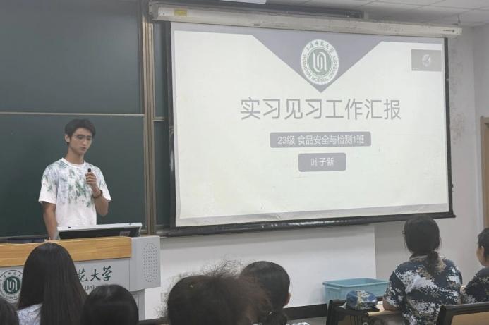 食品安全与检测专业叶子新学长聚焦“学术与实践融合”,分享了在光明乳业研究院、静安区共和新路街道食安办和市场监督管理所的实习经历。他从“如何找实习”讲起,提醒大家关注公众号、主动投简历,并强调“每一门课都有其价值”。他还介绍了学院特色社团“安全新食代”科普宣讲队,鼓励新生投身志愿服务,以专业所学回馈社会,“以食安之心,守护人间烟火”。