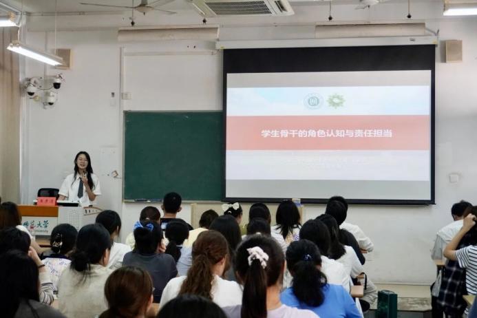 最后,张丽莹老师为本次培训致辞。她指出,举办工作人员集中培训,不单是技能学习,更是思想引领和成长赋能。期待同学们:珍惜机遇,在学习和奉献中成长;扛起责任,在实干和协作中担当;永葆勇气,在创新和挑战中突破。希望大家珍惜每一次学习和服务的机会,强化纪律作风、做到学以致用,在团学组织中发挥作用也收获成长。