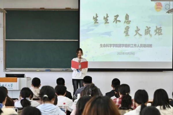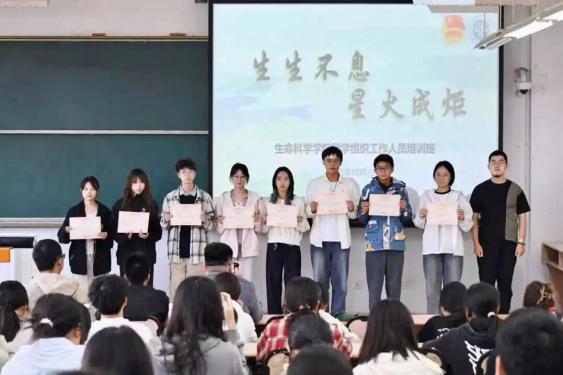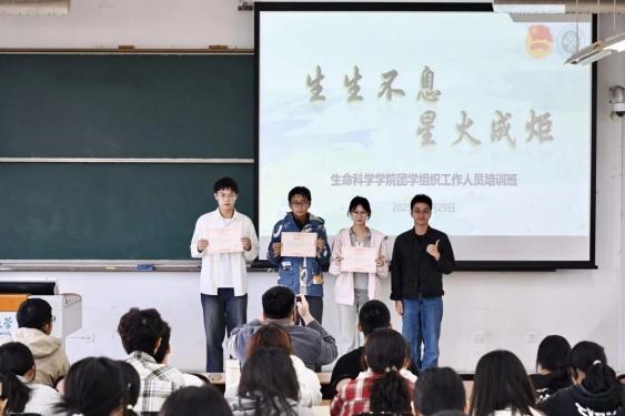 2025年10月29日中午,“生生不息 星火成炬”2025级团学组织工作人员培训班结业仪式在三教402举行。生命科学学院团委书记徐昊天、团学组织全体工作人员参加仪式。仪式由院学生会秘书部工作人员刘茜主持。