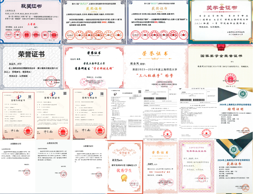 “竞赛是提升综合能力的‘快车道’,既锤炼技术,也磨砺团队协作。”赵金凤深知综合素养的重要性,积极参与各类高水平竞赛,屡获佳绩:“华为杯”中国研究生数学建模竞赛全国二等奖、三等奖;“挑战杯”全国大学生课外学术科技作品竞赛全国三等奖、上海市特等奖;“挑战杯”中国大学生创业计划竞赛上海市银奖;“兆易创新杯”中国研究生电子设计竞赛上海市二等奖;“华中杯”“中青杯”、MathorCup等数学建模竞赛全国一等奖2项、二等奖1项、三等奖1项;全国大学生物联网设计竞赛华东赛区二等奖;陈嘉庚青少年发明奖上海市二等奖;上海市百万青少年争创“明日科技之星”创意奖。