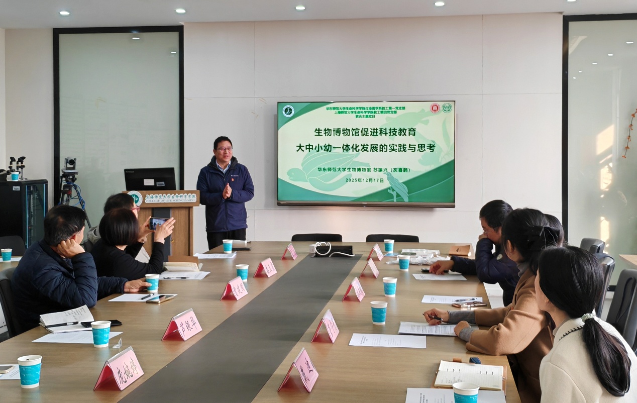 活动现场,两校代表就博物馆与标本馆的建设经验进行了深度分享。曹建国结合多年教学管理经验,从理想信念、专业技能、科研素养及师德师风等维度,系统阐述了新时代优秀生物师范生的培养路径。张美玲从宏观视角提出,应深度利用博物馆资源,将其打造为常态化的科技教育基地与创新实践平台,为两校未来的深度合作提供了思路。胡佳耀详细介绍了上海师范大学生物标本馆在科普资源建设、公众开放及特色活动开展方面取得的扎实成果。华东师范大学生命科学学院生物博物馆副馆长苏振兴分享了华东师范大学生物博物馆的运营理念、科普课程开发及社会服务经验,深入探讨了高校博物馆在连接学术研究与公众教育中的独特价值。