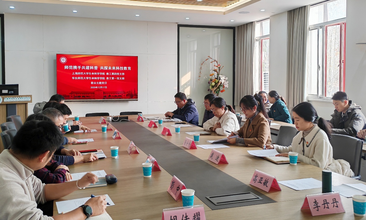 为深化校际交流,共谋科普教育创新发展,探索科技教育新模式,2025年12月17日下午,上海师范大学生命科学学院教工第四党支部与华东师范大学生命科学学院生命医学系教工第一党支部,在上海师范大学徐汇校区成功举办联合主题党日活动。上海师大生命科学学院副院长曹建国、华东师大生命科学学院副院长张美玲及两校党员教师代表参加。上海师大生命科学学院教工第四党支部书记殷子为主持。