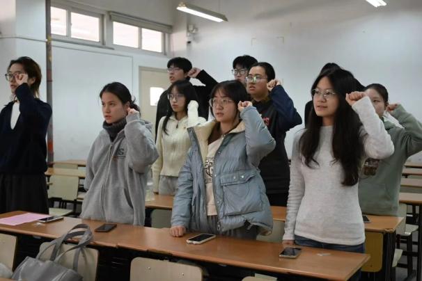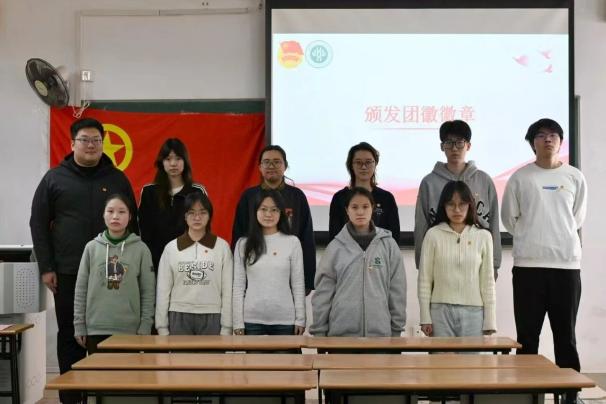 随后,徐昊天老师为全体新团员逐一颁发象征着光荣与责任的团徽。闪亮的团徽佩戴胸前,标志着他们正式成为共青团组织一员。