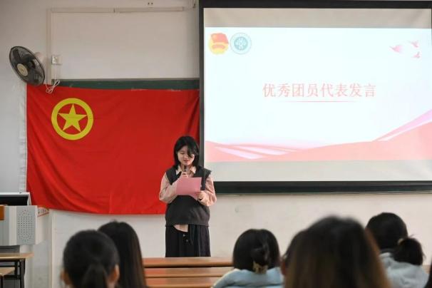来自2024级生物科学专业新团员代表钟依凡同学在发言中不仅表达对加入团组织的激动与自豪,更倡导大家要铭记入团誓言,坚定理想信念,努力学习、积极实践,以优秀团员标准时刻严格要求自己,让青春在全面建设社会主义现代化的实践中绽放绚丽之花。