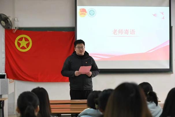 徐昊天老师代表学院团委向全体新团员表示热烈祝贺,并提出三点希望,一要胸怀远志,做心怀家国的追梦人;二要修身立德,做崇德向善的先行者;三要勤学笃行,做脚踏实地的实干家。他寄语新团员以青春之名,赴时代之约,在共青团的旗帜下书写无愧于时代、无愧于青春的壮丽篇章。