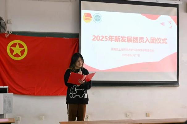 1217日下午,生命科学学院2025年下半年新发展团员入团仪式在奉贤校区第三教学楼401教室举行。学院团委书记徐昊天老师出席仪式,2025年下半年新发展团员、优秀团员代表参加仪式。本次仪式由院团委组织部部门负责人张语嫣主持。